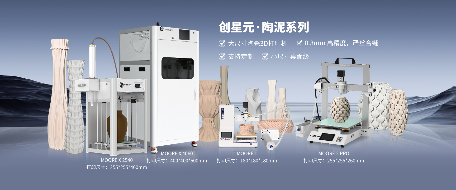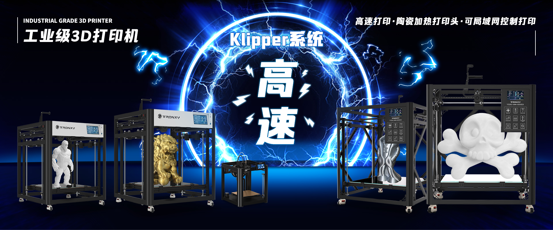 自主設計,定制生產(chǎn)線,可生產(chǎn)從桌面級到工業(yè)級等 尺寸從180mm到1.6米的3D打印機